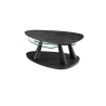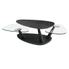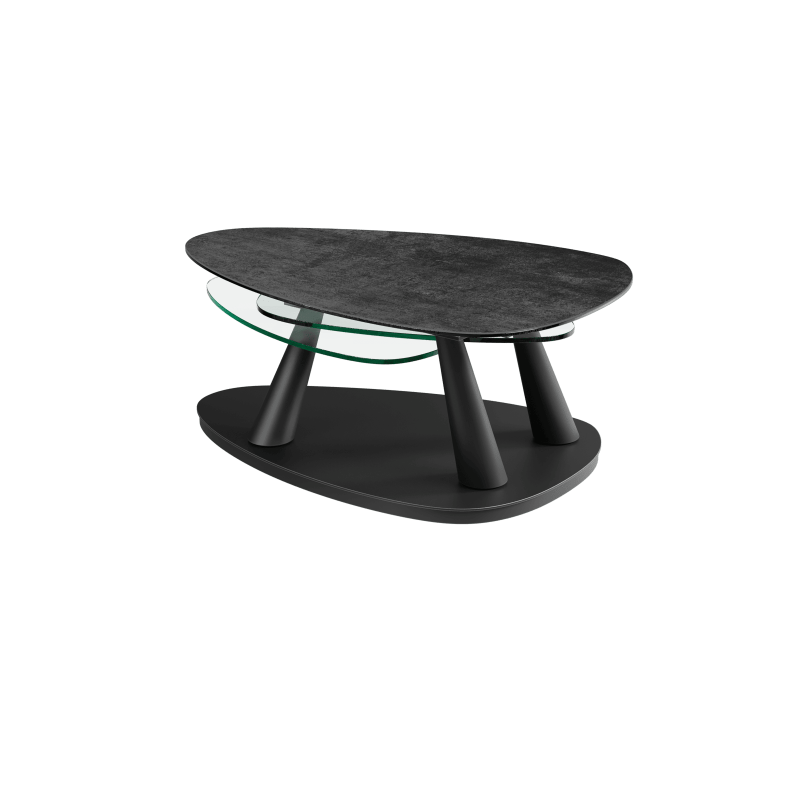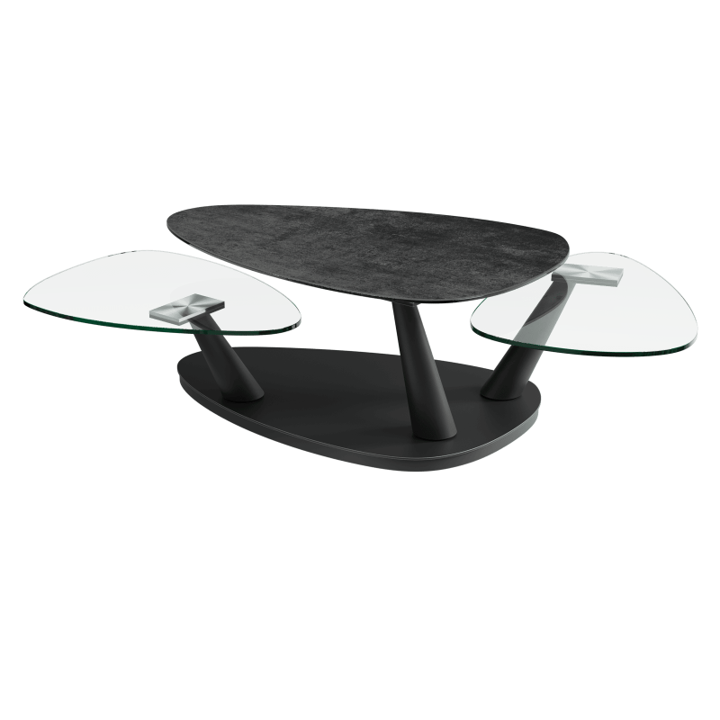 Les plateaux inférieurs (conçus en verre trempé de 10 mm) pivotent autour d’une base conique en acier laqué noir mat.