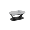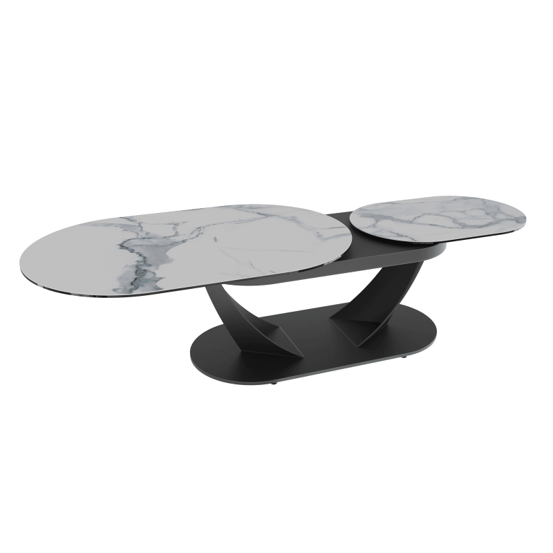 Sa structure se compose de deux bras incurvés en acier laqué noir mat, fixés à une base reprenant la forme ovale des plateaux pour une harmonie parfaite.