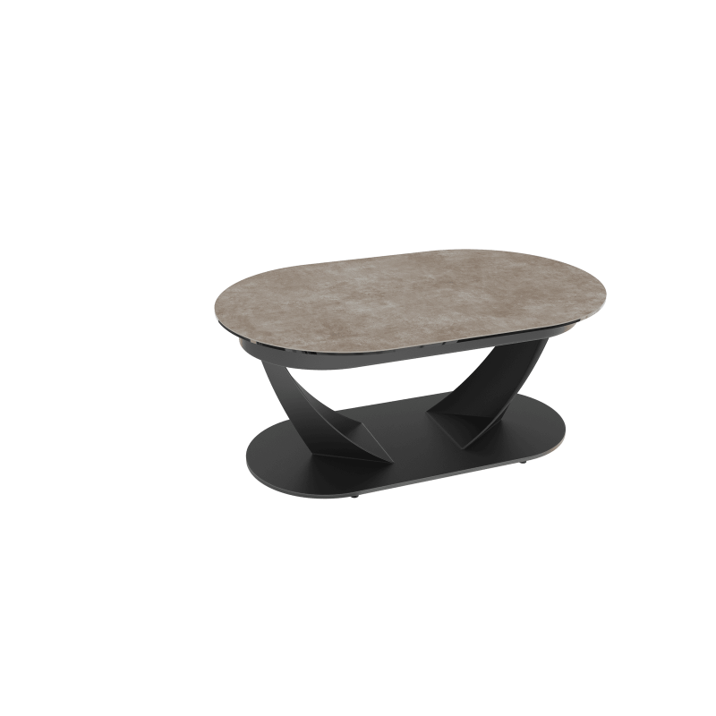 Sa structure se compose de deux bras incurvés en acier laqué noir mat, fixés à une base reprenant la forme ovale des plateaux pour une harmonie parfaite.