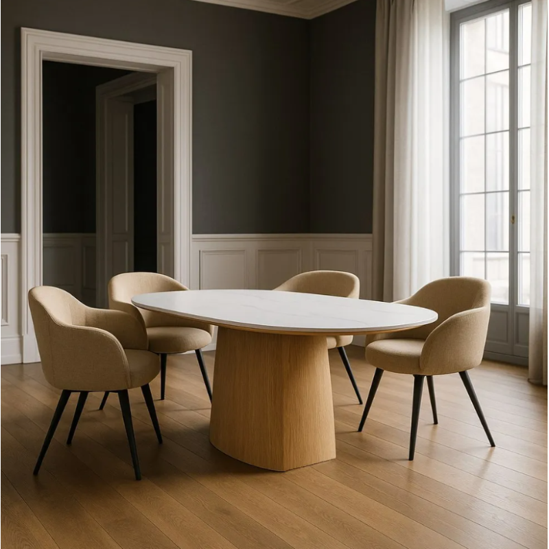 Grâce à sa forme ovale, cette table favorise la convivialité et s’adapte aussi bien aux espaces ouverts qu’aux pièces plus intimistes.
