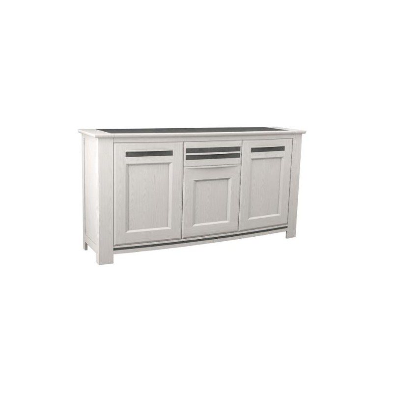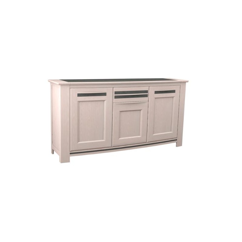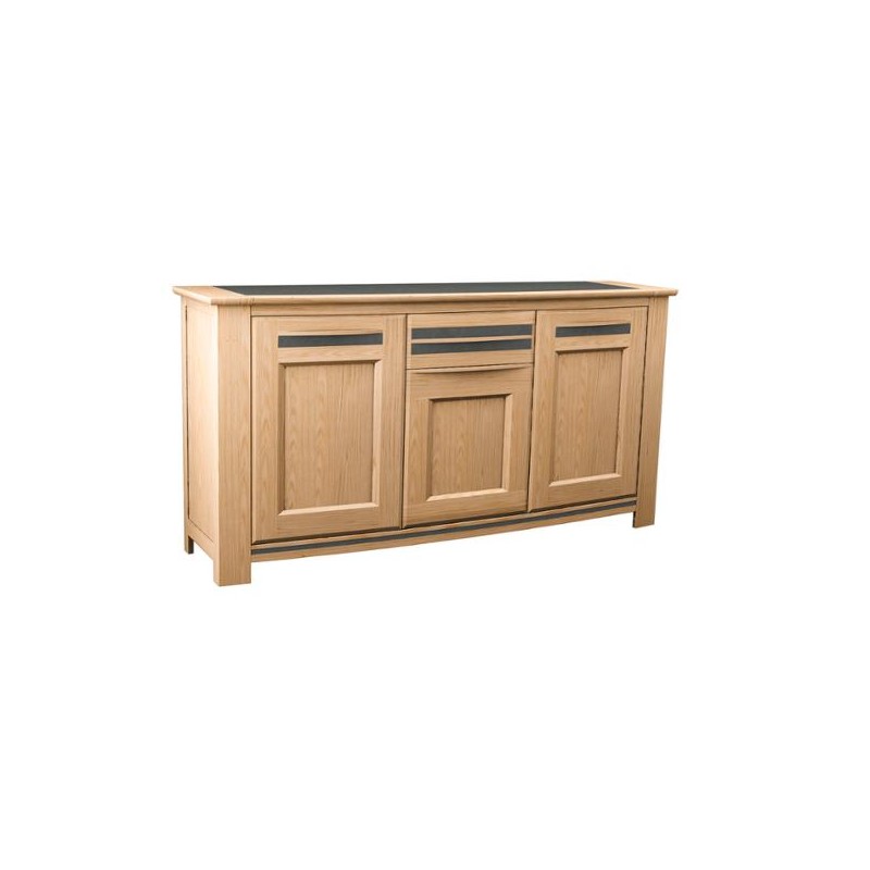 Voici notre buffet 3 portes Malaga façade en courbe , bois de chêne et incrustation céramique Véritable meuble de rangement, équipé de 3 portes ouvrant chacune sur une étagère et un tiroir sur la porte du milieu.