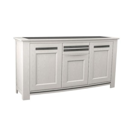 Voici notre buffet 3 portes Malaga façade en courbe , bois de chêne et incrustation céramique Véritable meuble de rangement, équipé de 3 portes ouvrant chacune sur une étagère et un tiroir sur la porte du milieu.