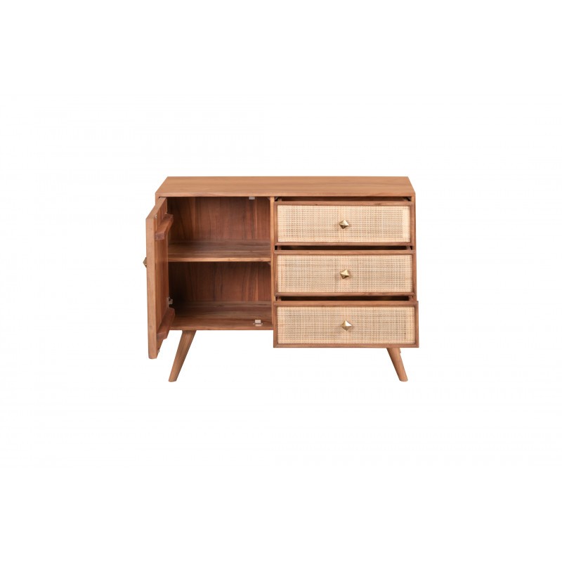 Voici notre buffet Paris en bois d'acacia. Véritable meuble de rangement, équipé de 1 porte et 3 tiroirs.