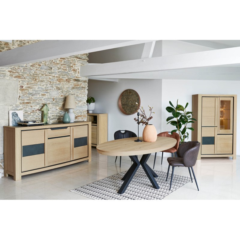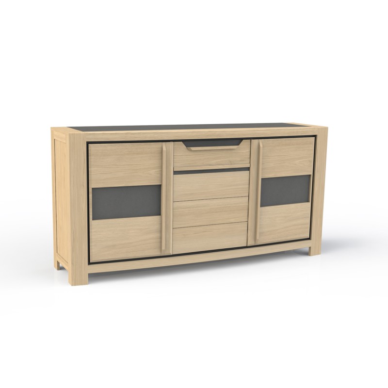 Voici notre buffet 3 portes Torus en bois de chêne avec incrustation céramique sur la façade et le dessus, disponible en deux teintes différentes. Véritable meuble de rangement, équipé de 3 portes ouvrant chacune sur une étagère et un tiroir sur la porte du milieu.