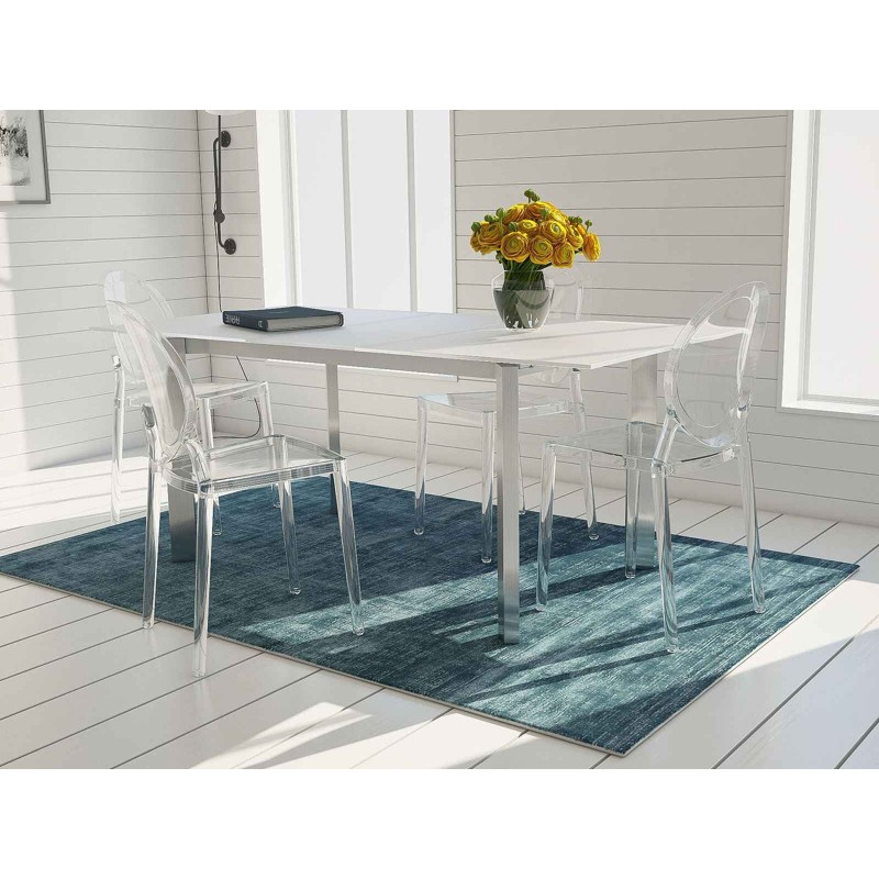 La chaise transparente est originale et bien proportionnée.