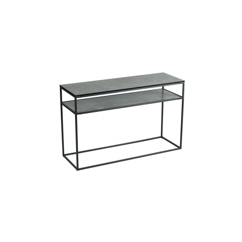 Dessus verre feuilleté 12mm, rayon en verre trempé 8mm, peinture cuite au four, finition aspect céramique (résistant aux rayures), piètement acier, laque époxy anthracite mat