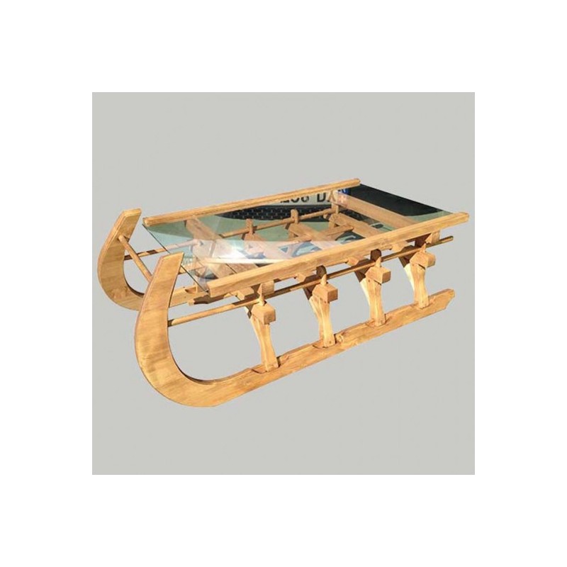 Table basse luge Alpes  en sapin massif cirée avec dessus verre.
