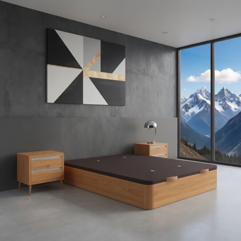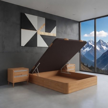 Voici notre Lit-Coffre Zoe design moderne et élégant sa structure decor bois et son châssis renforcé avec valves d'aération.