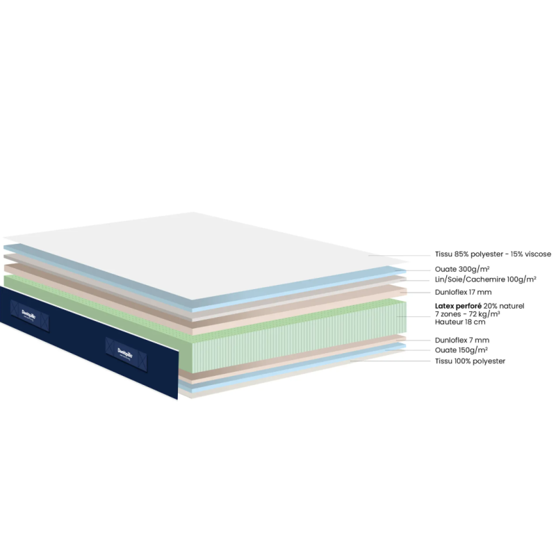 Le matelas Dunlopillo Calypso est composé de 18 cm de latex perforé à 20% naturel et 7 zones de confort. Cette technologie assure une ventilation optimale et une hygiène parfaite en permettant à votre matelas de respirer toute la nuit.