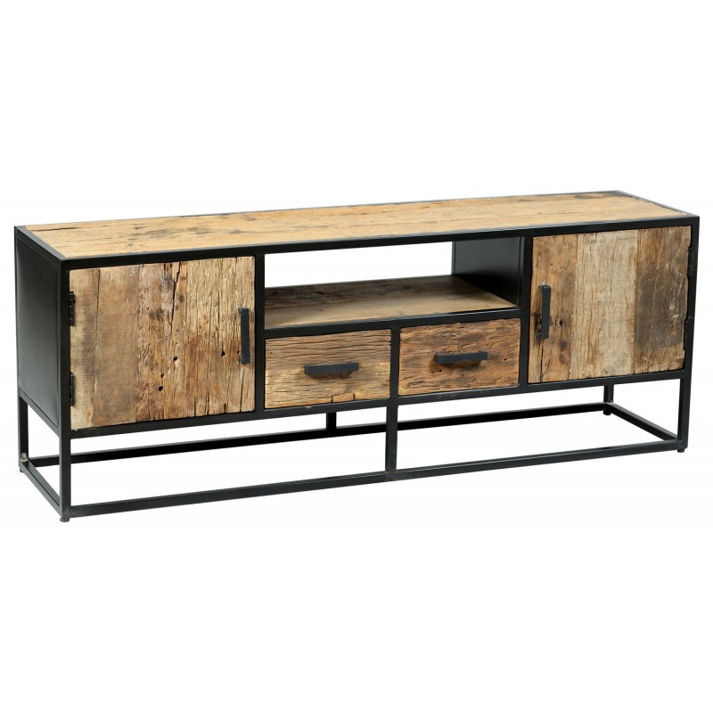 Voici notre meuble TV en bois de teck et acier. Véritable meuble de rangement, équipé de 2 tiroirs et 2 portes.
