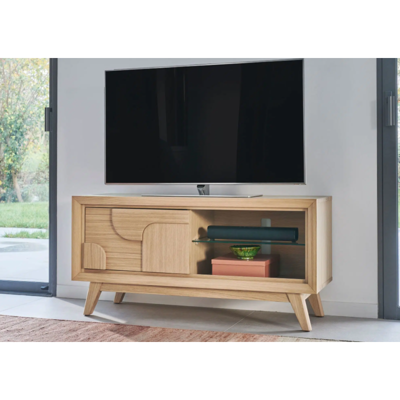 Voici notre meuble TV Rio en bois de chêne. Véritable meuble de rangement, équipé de 1 porte