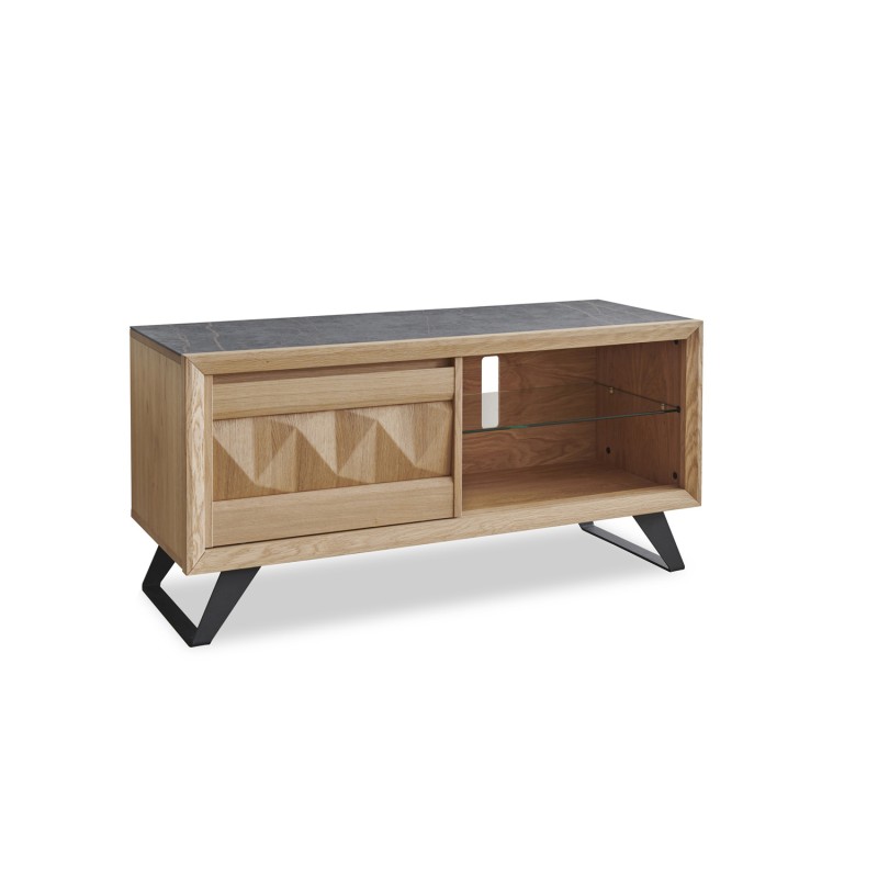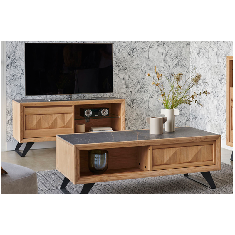 Meuble TV chêne et céramique 1 porte coulissante 1 niche avec tablette en verre