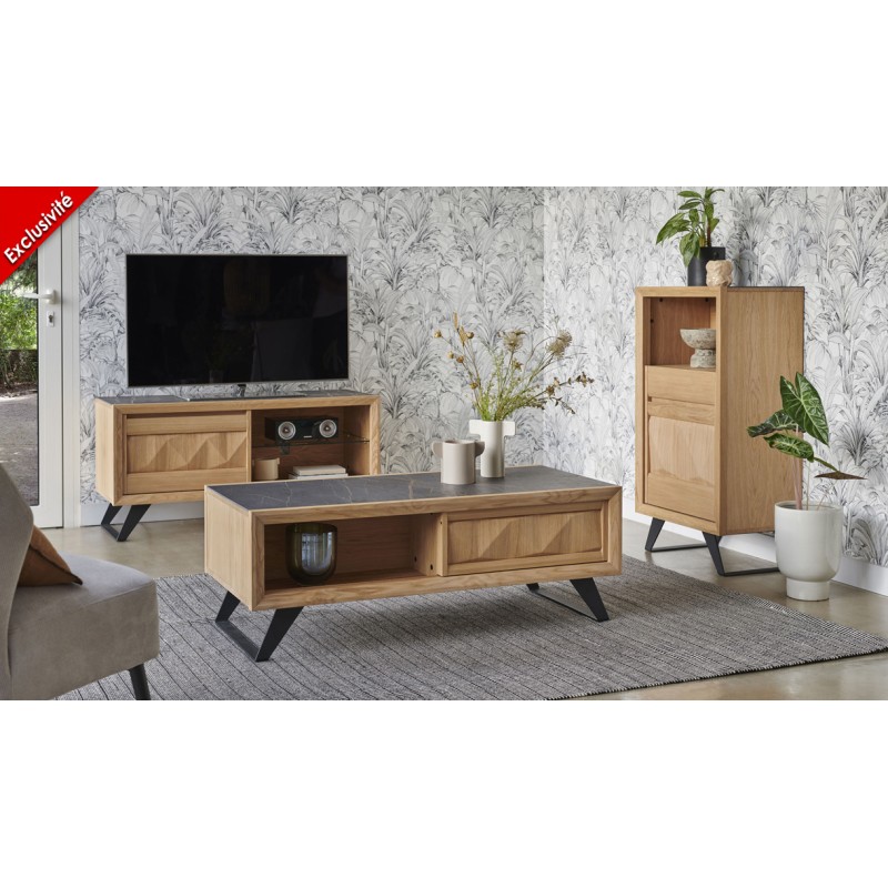 Voici notre meuble TV 1 porte coulissante 1 niche Delta en bois de chêne et céramique.