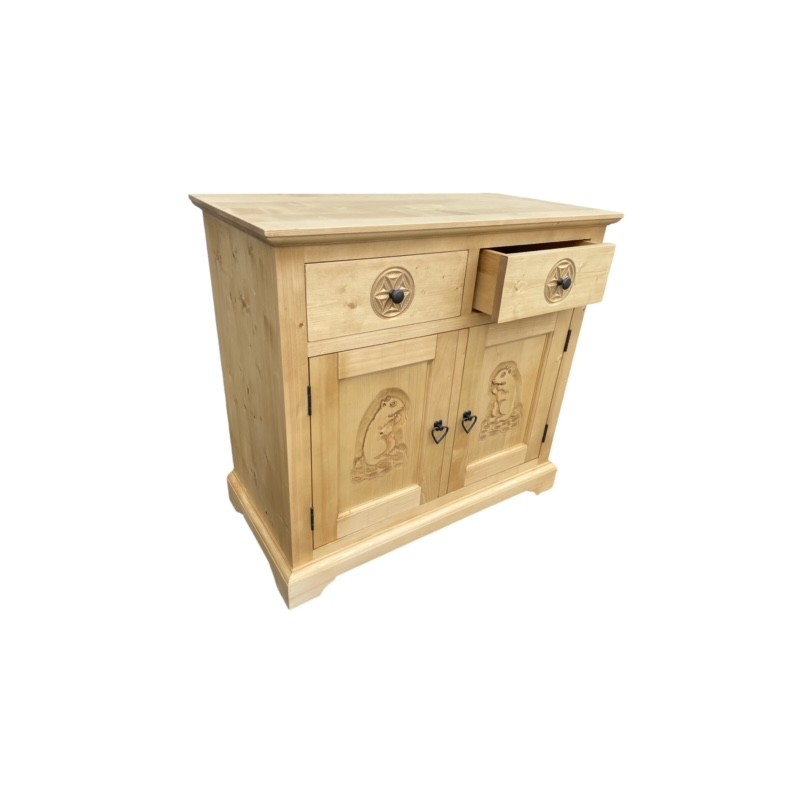 Voici notre bahut 2 portes 2 tiroirs, sculpture marmotte en sapin cirée massif.