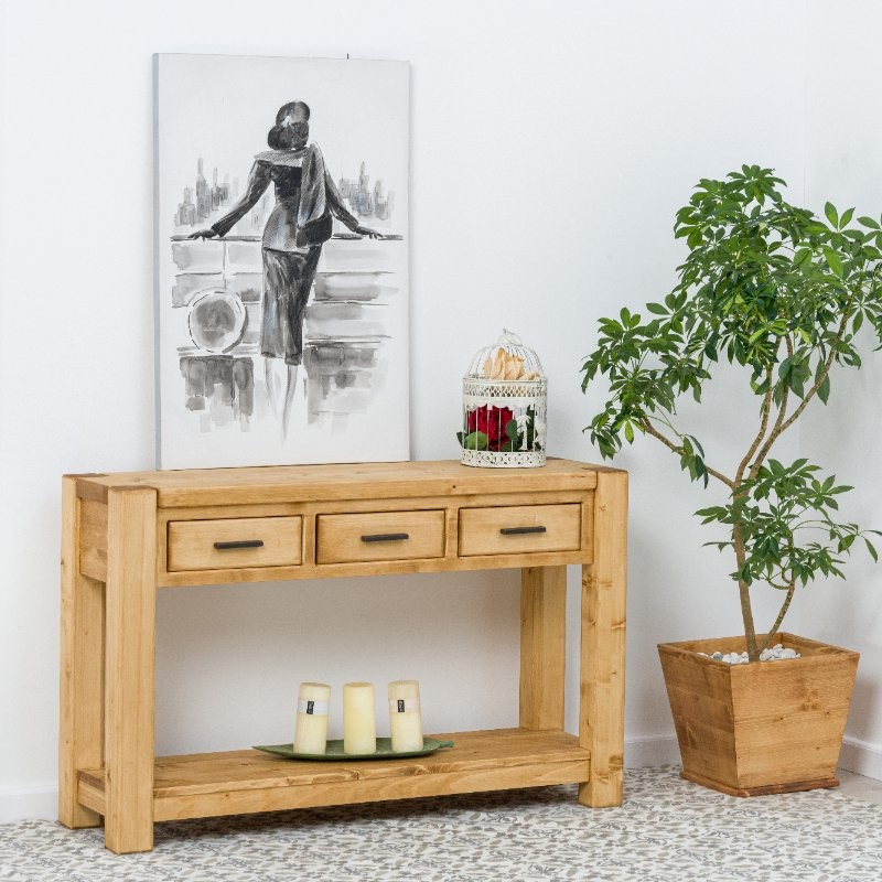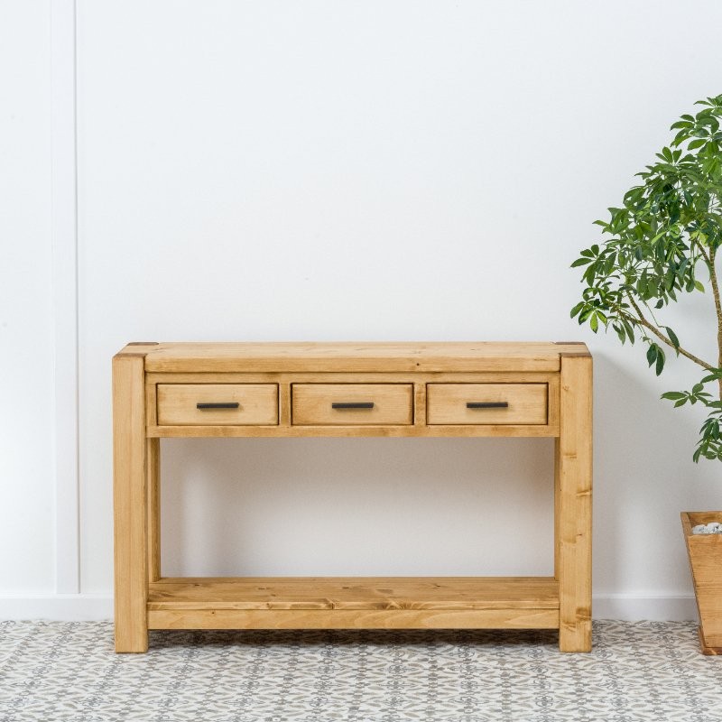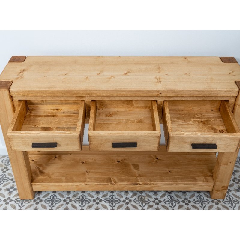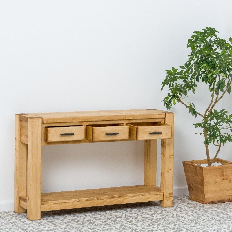 Voici notre console 3 tiroirs en bois de sapin ciré massif.