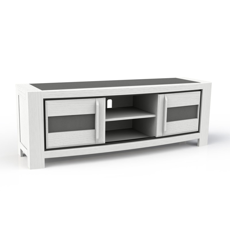 Voici notre meuble TV 2 portes, 1 niche Torus en bois de chêne avec incrustation céramique sur la façade et le dessus, disponible en deux teintes différentes.