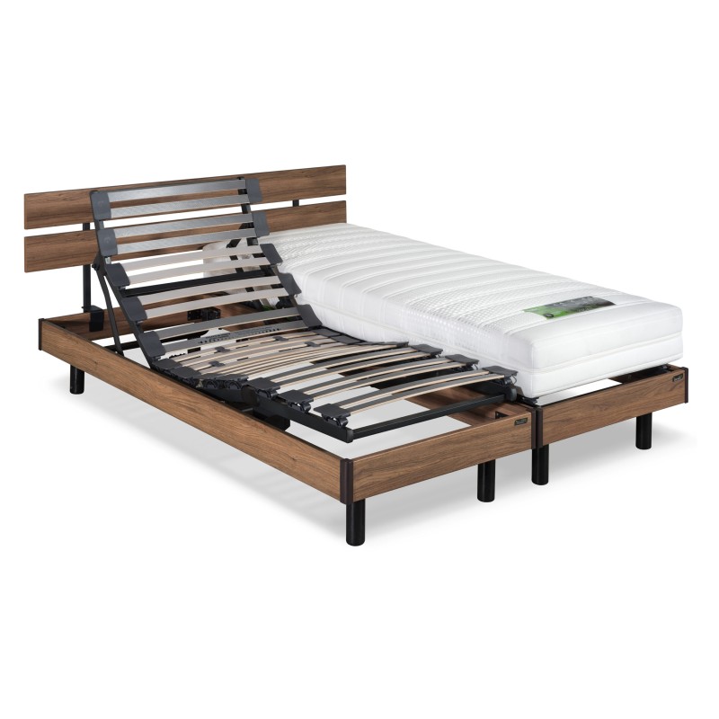 Ensemble literie électrique double avec sommiers électriques et matelas latex, caisse couleur chêne naturel.