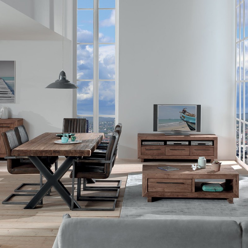 Voici notre table basse en bois de teck massif recyclé. Véritable meuble de rangement, équipé de 2 tiroirs et une niche.