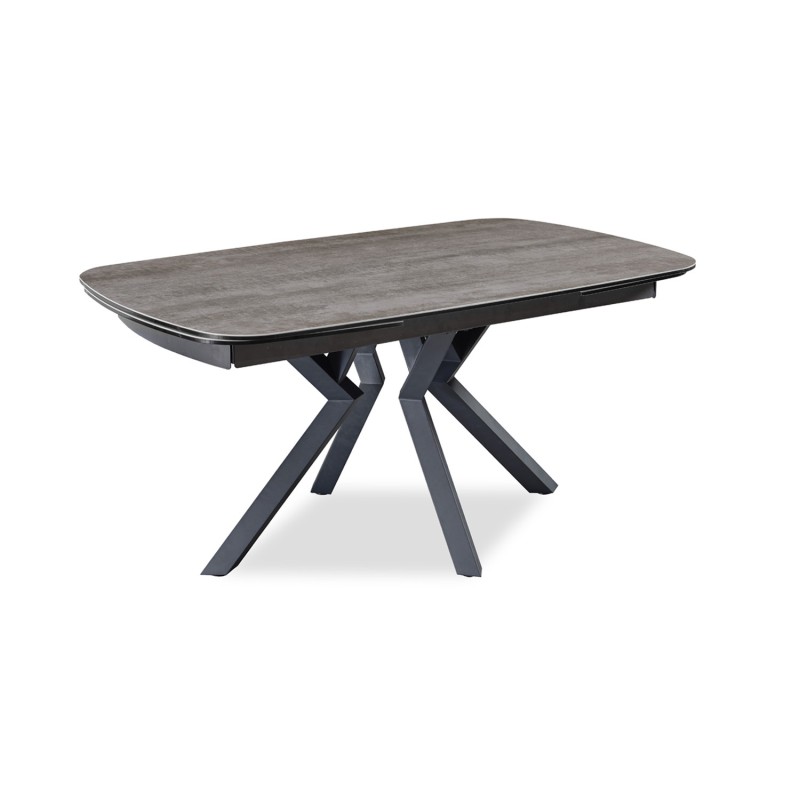 Voici notre table tonneau plateau céramique pied central en croix allonges intégrées en bout de 50cm chacune.
