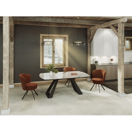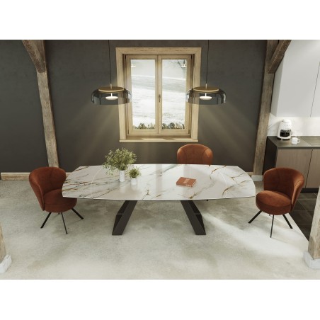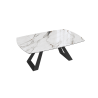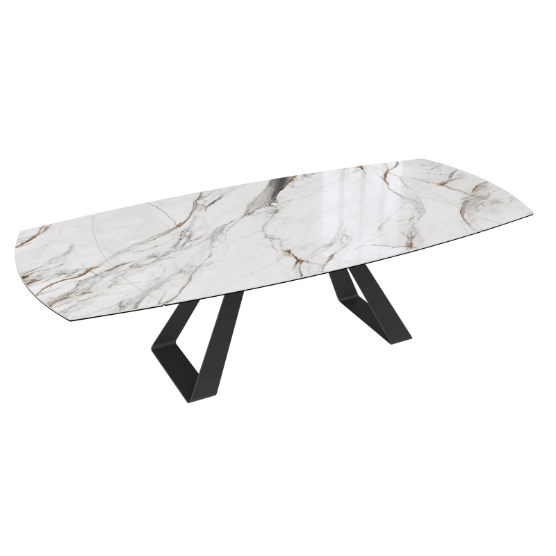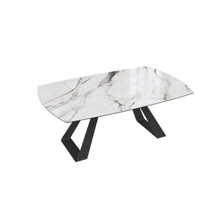 Ce modèle est conçu en céramique Marbre Fiorentino de 6 mm collée sur un verre de 8 mm. Son élégant piétement ajouré est en acier laqué noir mat.