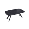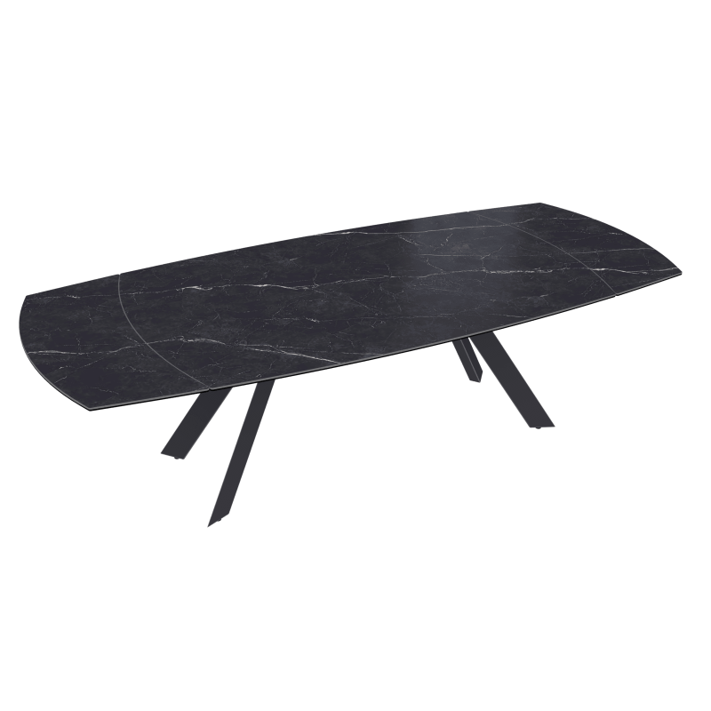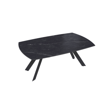 La céramique Marbre Marquina de 6 mm, collée sur un verre de 8 mm s’associe parfaitement au piétement en acier laqué noir mat.