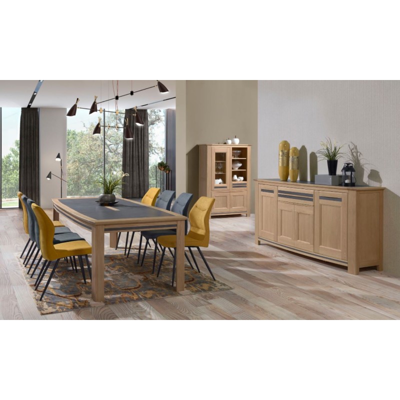 Voici notre table tonneau Malaga en chêne avec plateau et allonges en céramique. équipé de deux allonges centrale papillon de 40cm avec coulisses métallique