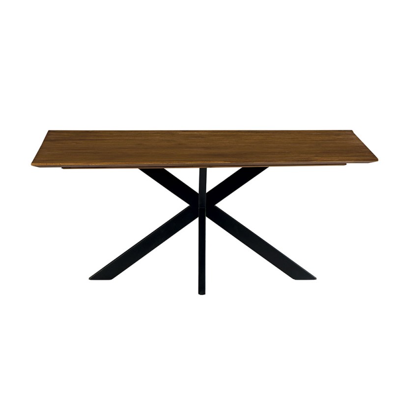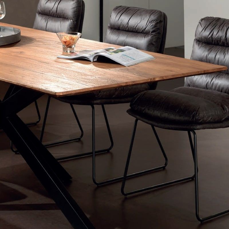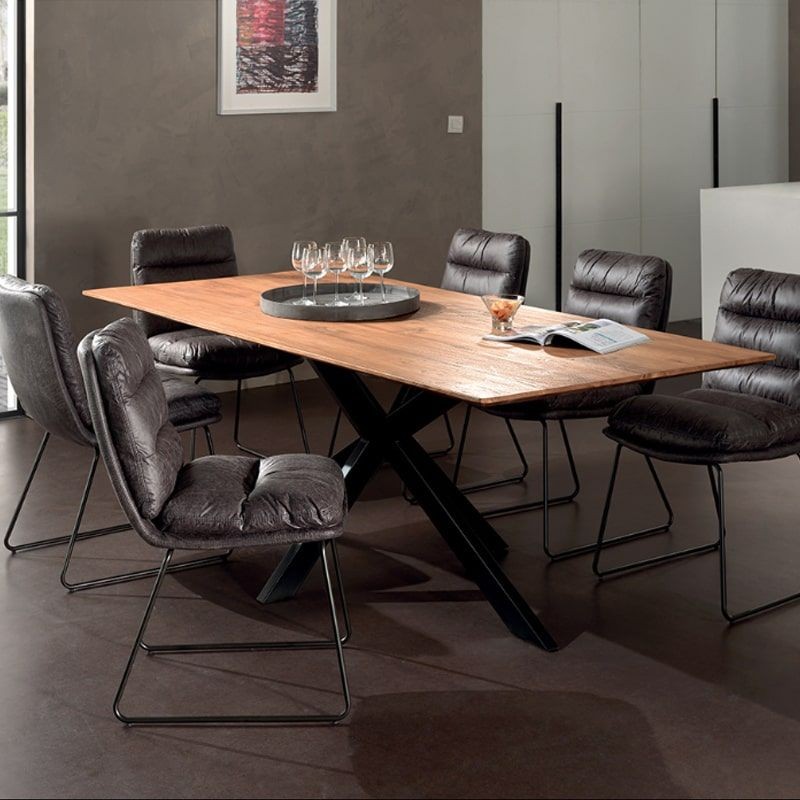 Voici notre table de repas en teck massif naturel recyclé. Le pied métal central offre stabilité et un confort exceptionnels.