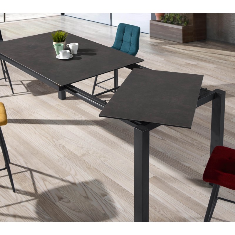 Voici notre table snack haute rectangulaire 1 allonge rotative en bout de 60cm en céramique moucheté grise.