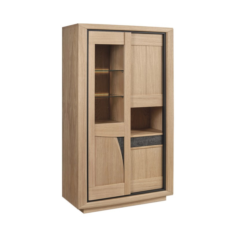 Disponible en chêne naturel ou chêne blanchi, chaque meuble est rehaussé d’une incrustation en céramique, apportant une touche moderne et minérale à l’ensemble.
